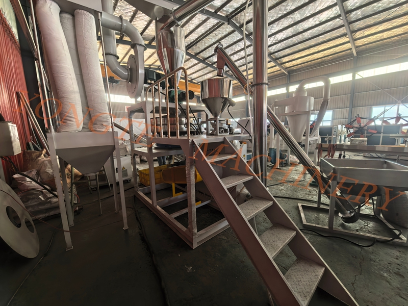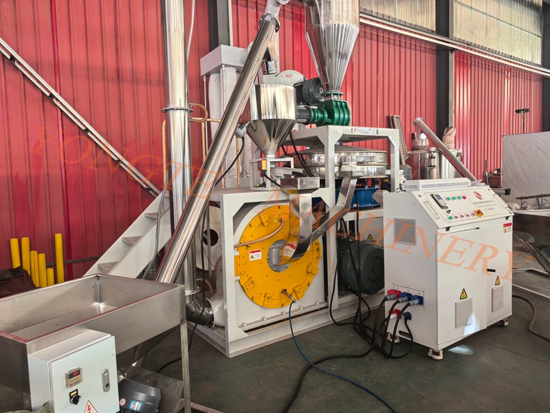 Im Hinblick auf die Leistung hat Yongte Plastics Machinery drei Schlüsselaspekte verbessert, um professionelle Qualität zu gewährleisten. An der Zufuhrseite ist ein Vorplastifiziermodul mit Doppelscherwalzen und einem Einlass für zerstäubten Weichmacher angebracht. Dabei wird mechanisches Scheren bei 3.000–5.000 U/min in Kombination mit der präzisen Zugabe von 1–3 % Weichmacher verwendet, um die Gummihärte von Shore A 60–70 auf Shore A 40–50 zu reduzieren und so die Verarbeitungsherausforderung der hohen Elastizität von Gummi, die das Zerkleinern erschwert, grundlegend zu lösen. Die Kernmahlkomponenten wurden auf mit Wolframkarbid beschichtete Zahnwalzen umgerüstet, die eine Härte von HRC 70–75 und eine achtfach höhere Verschleißfestigkeit aufweisen und den Auswirkungen von Stahldrahtresten im Altgummi effektiv standhalten. Das System verfügt außerdem über ein duales Temperaturkontrolldesign mit einem spiralförmigen Wasserkühlmantel und multidirektionalen Luftkühldüsen, das eine stabile Mahlkammertemperatur unter 40 °C gewährleistet und die Adhäsionsrate des Gummipulvers an der Wand deutlich von 30 % auf weniger als 5 % reduziert. Darüber hinaus sind am Ende der Anlage ein eingebauter Windsichter und eine Grobpulver-Rückführleitung integriert. Die einstellbare Klassierradgeschwindigkeit von 3.000–10.000 U/min ermöglicht eine präzise Steuerung der Endproduktfeinheit von 40–120 Mesh und sorgt so für eine konstante Ausbeute von über 95 %.